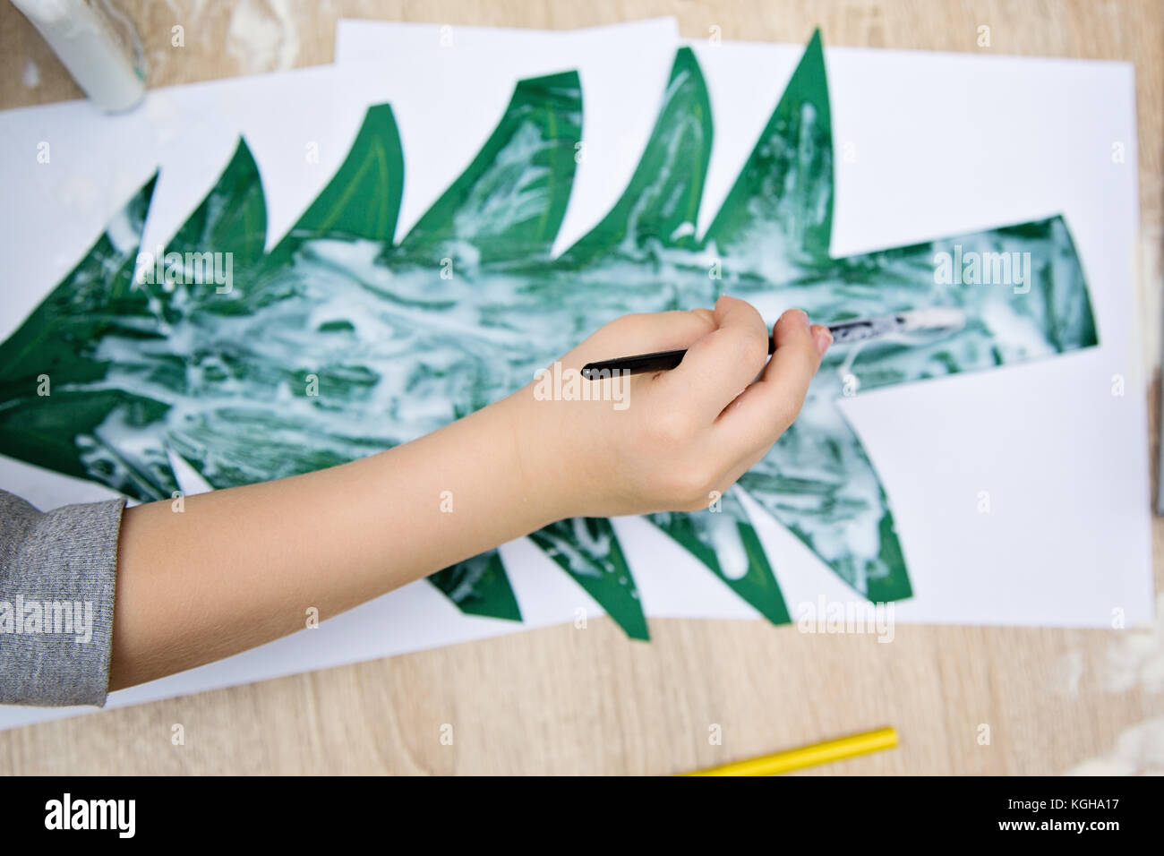 Boy Toddler Hand Painting Glue With Brush On A Paper Christmas Tree Stock Photo Alamy
