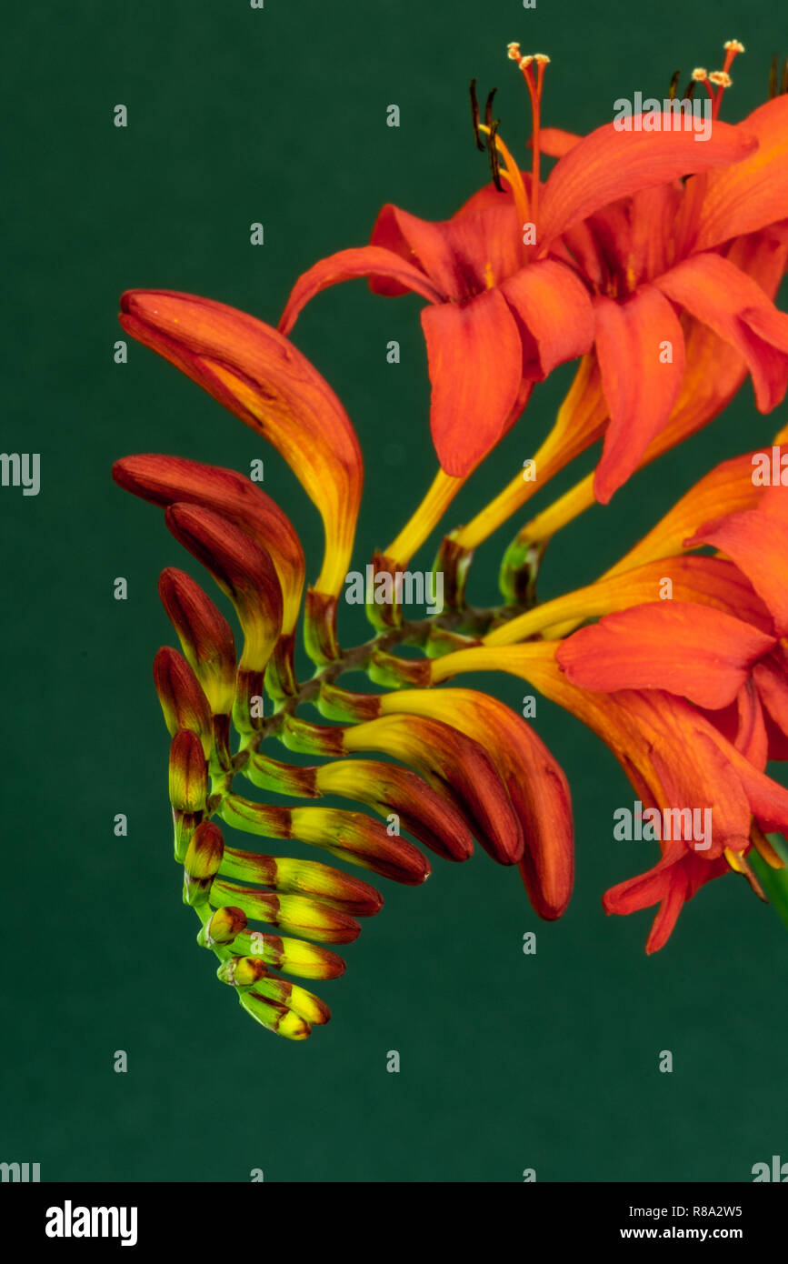 Las Bellas Artes Todavia La Vida De Color De Una Imagen Macro Unico Aislado Montbretia Crocosmia Rojo Sobre Fondo De Papel Verde En Vintage Estilo De Pintura Fotografia De Stock Alamy
