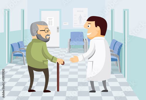 Doctor And Patient Medical Specialist Consulting With An Elderly Patient Practitioner Welcomes An Old Sick Man Cartoon Stock Vector Illustration Of Consultation Assistance 141850759