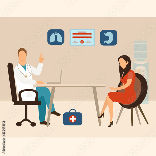 Medicine Concept Practitioner Doctor Man And Young Fashionable Woman Patient In Hospital Medical Office Or Polyclinic Consultation And Diagnosis Vector Illustration In Flat Cartoon Style Buy This Stock Vector And Explore