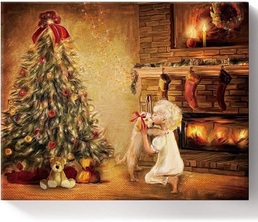 Amazon Com Diy Paint By Numbers For Adults Diy Oil Painting Kit For Kids Beginner Christmas Cute Kids And Puppy With Xmas Tree Fireplace Art Print Canvas Wall Print Art Bedroom Living Room