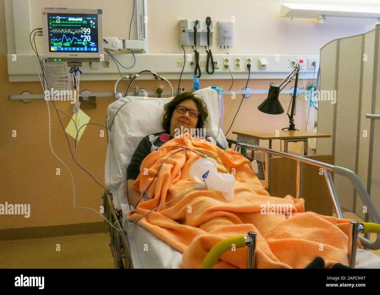 A Female Patient Laying In A Hospital Bed In The Er Emergency Room Hooked Up A Heart Monitor And Iv While Waiting For Diagnostic Tests And A Diagnosis Real People Human