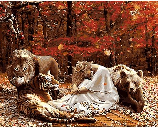 Pintar Por Numeros Adultos Ninos Diy Pintura La Bella Y La Bestia Leon Tigre Oso 40x50cm Amazon Es Hogar